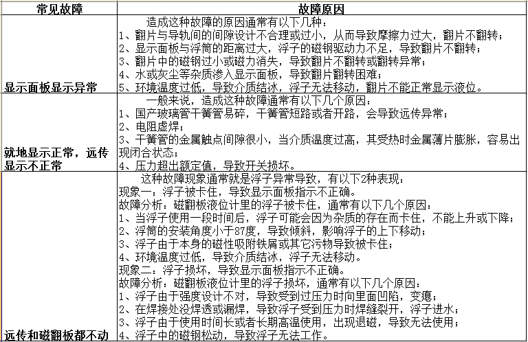 磁翻板液位計在實際應用中經(jīng)常會出現(xiàn)故障,在這些故障中,有些是由單個部件故障引起的,有些是由多個部件同時故障引起的。磁翻板液位計的常見故障及其原因分析如下: