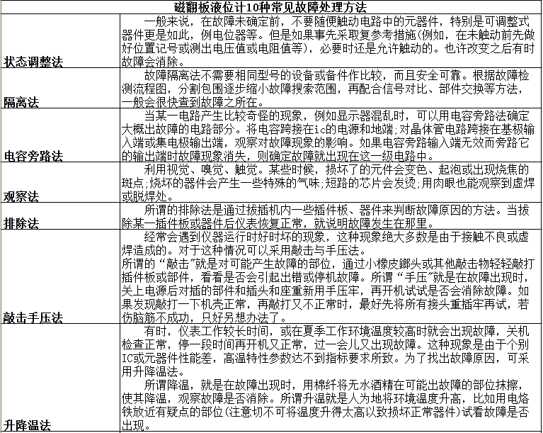 磁翻板液位計在使用過程中由于操作方法以及環(huán)境問題,在使用中會造成一定的故障問題,對于產(chǎn)品的使用有一定的影響。下面來具體介紹一下磁翻板液位計10種常見故障處理方法。